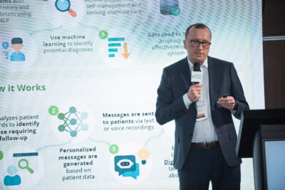 Prelegenci skrótowo omówili innowacyjne rozwiązanie, które umożliwia i usprawnia pracę na potężnych bazach danych z dokumentacji medycznych. Funkcjonalność narzędzia wynika z możliwości kontaktu z przekazaną dokumentacją w języku naturalnym, czyli np. uzyskania odpowiedzi na pytania, co jest w danych zbiorach. Przyspiesza to pracę zespołu medycznego i wpływa na proces diagnostyczny.