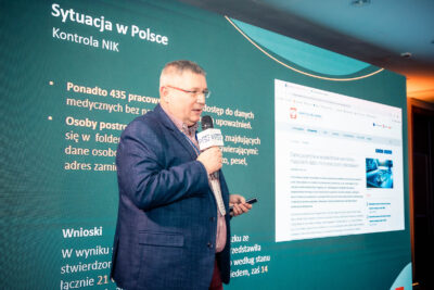 Temat cyber security nie uleciał jednak na długo. Po 1,5 godzinie poświęconej zielonym szpitalom temat bezpieczeństwa powrócił za sprawą wystąpienia Marka Graczyka z firmy Eskom, który poruszył temat informatyzacji szpitali w kontekście dyrektywy NIS 2. – Nie będę dzisiaj Państwa straszył – podkreślał prelegent. – NIS 2 jest to naprawdę dyrektywa, którą bez obaw możecie wdrożyć w swoich placówkach.