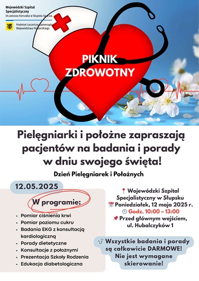 Wojewódzki Szpital Specjalistyczny w Słupsku zaprasza wszystkich mieszkańców Słupska i regionu na specjalną akcję badań i porad zdrowotnych. W poniedziałek, 12 maja przed głównym wejściem do szpitala przy ul. Hubalczyków 1 zostanie zorganizowany piknik zdrowotny.